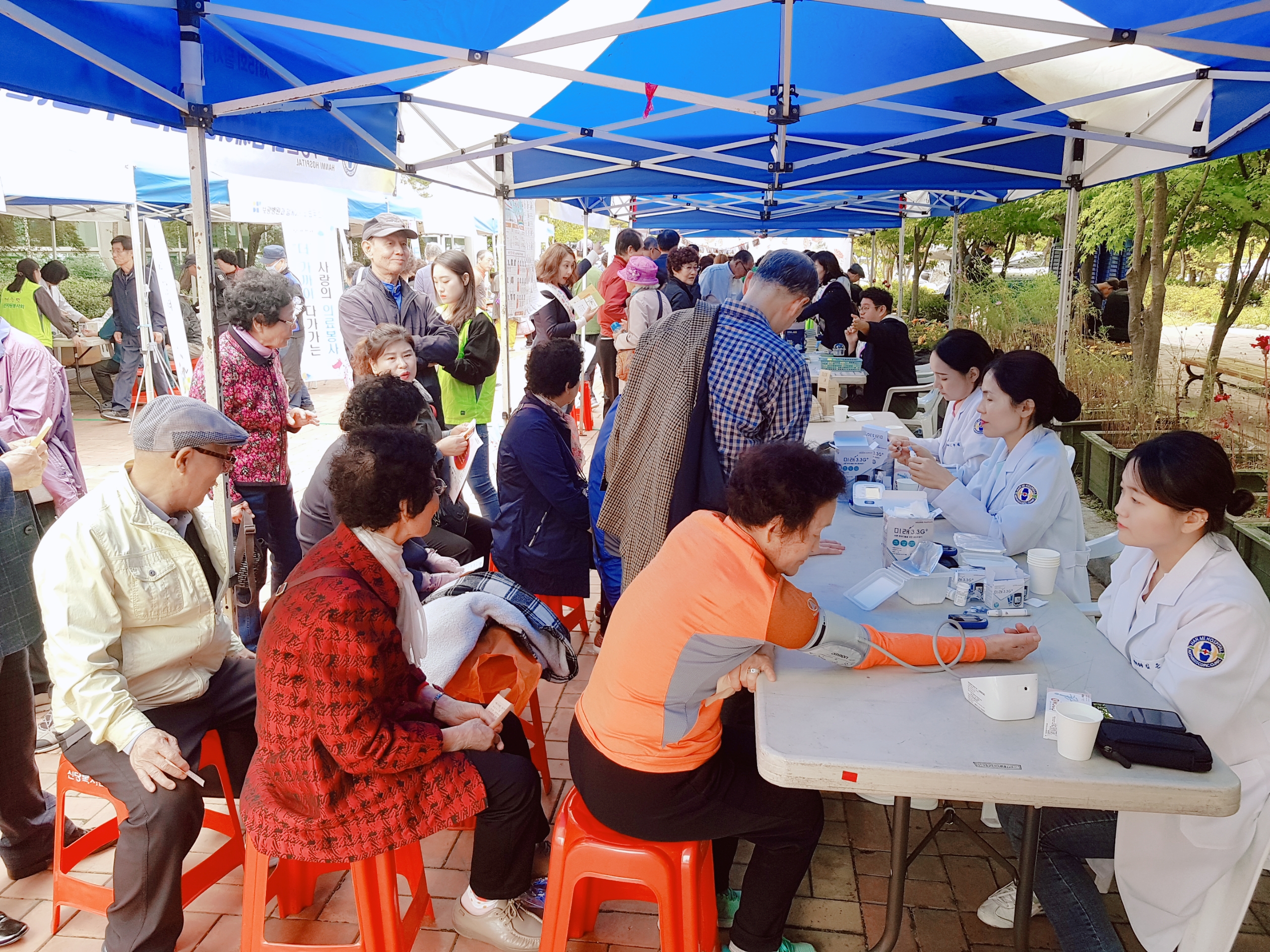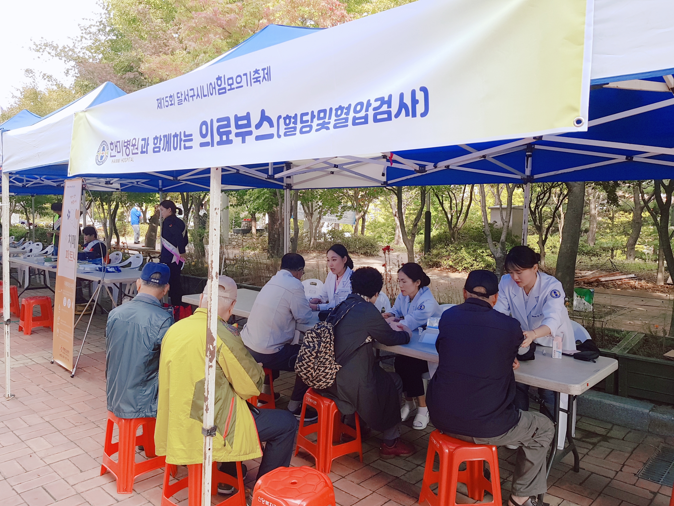 저희 한미병원에서는 의료부스를 설치하여 어르신분들의 혈당 및 혈압 검사를 도와드렸습니다.