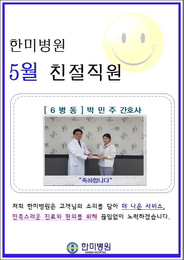 5월 한미병원 친절직원 선정(6병동 박민주 간호사)